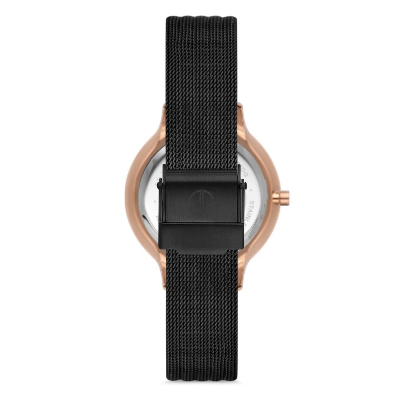 Bu saatte gül altın tonu, siyah kadranla bir araya geldiğinde heyecan verici bir duruş sunar. İnce tasarımı ve sağlam çelik bilezik, gün boyu bileğinizde varlığını hissettirir ama rahatsız etmez.