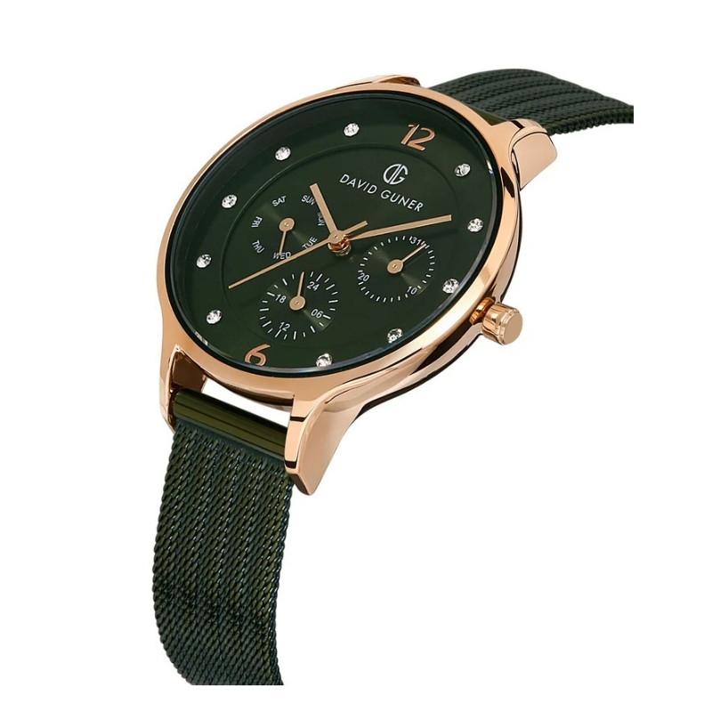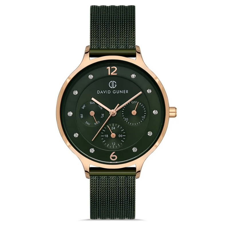David Guner Kadın Kol Saati DG-8120LC-ZG10 , zarafeti ve işlevselliği bir araya getiren şık bir modeldir. Rose gold kaplamalı kasası ve göz alıcı yeşil kadranı ile dikkat çeken bu saat, çelik örme kordonu sayesinde hem konforlu hem de dayanıklıdır. Gün, tarih ve 24 saat göstergeleriyle donatılmış olan bu model, günlük kullanımda da şıklığından ödün vermeyen kadınların tercihi olacak. Stil sahibi bir dokunuş arayanlar için ideal!