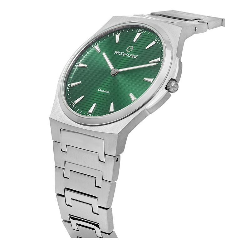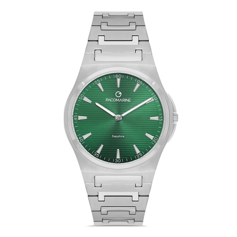 Bu Pacomarine Kol Saati, 46 mm’lik kasa çapıyla ultra ince tasarımıyla, ne fazla büyük ne fazla küçük, tam ideal bir duruş sunar. Gri çelik bilezik, bileği nazikçe sarar; her ortamda hem stil sahibi hem rahat bir his yaratır. Yeşil kadran, sade indekslerin eşsiz kontrastıyla göz alıcıdır ve aynı zamanda okunabilirliği üst düzeye çıkarır. Safir cam günlük hayata mükemmel uyum sağlar ve çizilmelere karşı direnç gösterir.
