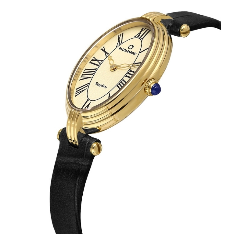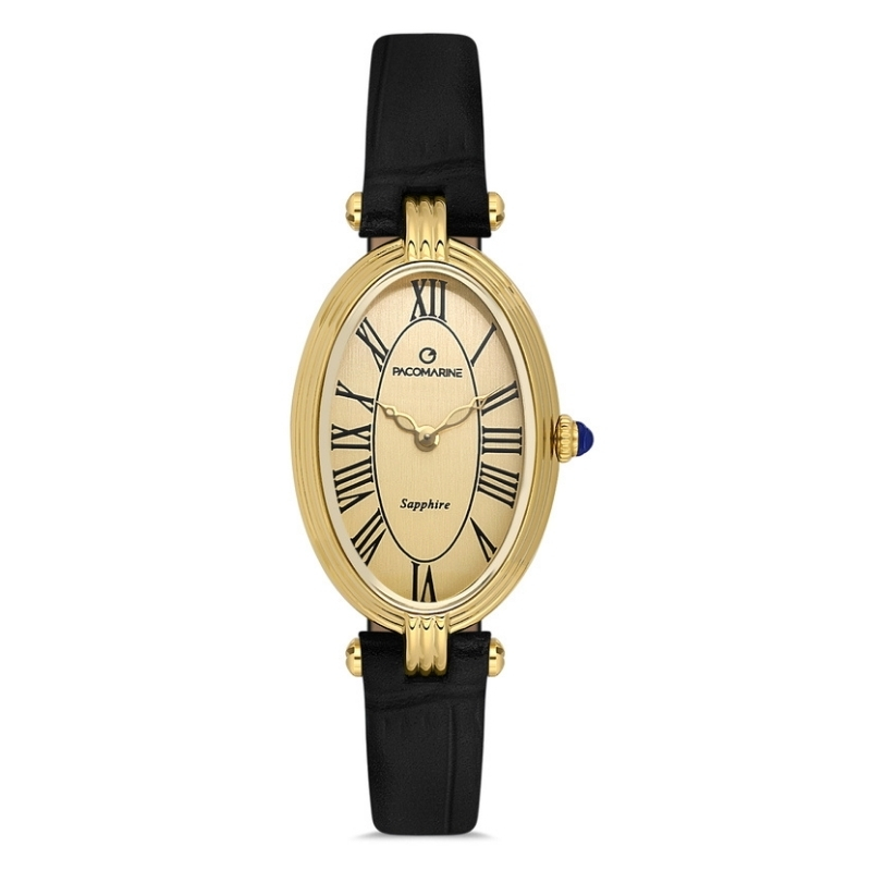 Pacomarine Kadın Kol Saati PM.23210.03 , oval altın kasa, safir cam, siyah deri kordon ve quartz mekanizmasıyla ince bileklere uyum sağlayan zarif ve fonksiyonel bir saat seçeneği sunar.