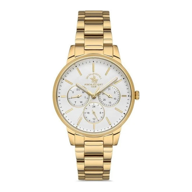 Santa Barbara Polo Racquet Club Kadın Kol Saati SB.1.10339.5 , zarif altın tonu ve beyaz kadranıyla sade şıklığı bileğinize taşır. Kronometre ve tarih özellikleriyle hem pratik hem estetik bir arkadaş olur. Aynı zamanda 5 ATM su geçirmezlik, her ortamda güvenli kullanım sunar.